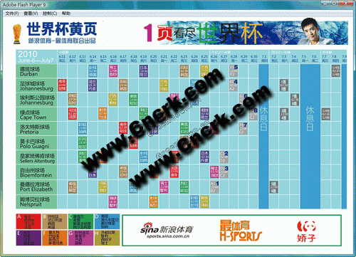 “世界杯黄页”,一页在手,看尽世界杯——1个国家、9个城市、10座球场、31天比赛、32只豪强、64场争夺、736条好汉……所有和世界杯比赛有关的资料都被浓缩在一个可大可小的电子页中,方便保存,方便查找,自动更新,电脑或者手机都可下载