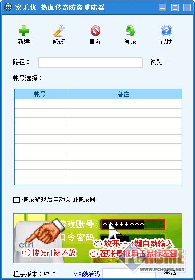 密无忧-热血传奇防盗登陆器V7.2(单机),是热血传奇游戏自动登陆软件,具有密码保护,防止盗号功能,是高级游戏用户,职业玩家,游戏代练辅助工具。适用热血传奇官方游戏窗口模式屏幕分辨率(使用游戏默认的窗口大小800*600),请使用游戏默认的窗口大小模式屏幕分辨率!