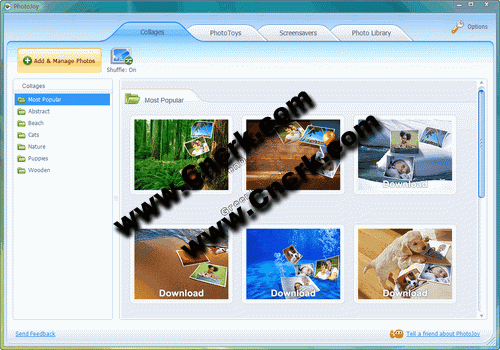Photojoy V2.0.0.1062 英文绿色免费版 Photojoy是 qingchuan 推荐的一款非常经典的免费桌面美化软件,可以将本地图片制作成漂亮的壁纸及超酷的动画屏保等。Photojoy主要有三部分功能:照片拼贴画 (Photo Collages)、3D屏幕保护 (Screensavers)、桌面Widget (PhotoToys)
