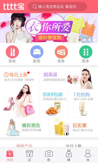 比比宝是一款主打特卖商品的应用,专业买手精挑细选,真的很赞,是全网返利,还有各种积分活动,快来选购吧!【软件特点】