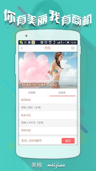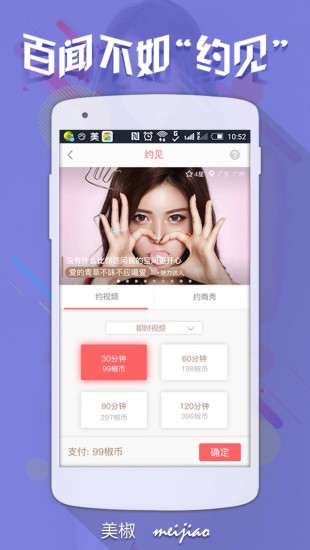 美椒Mo手机客户端是一款关于在线约会美女的软件,用户可以在本款软件上通过视频与你喜欢的人约会,公司需要礼仪、模特等等也可以通过本款软件约人,视频最真实,拒绝照骗!一个全民兴奋的平台,提供在线约见女神,模特,网红,经纪人.百闻不如"约见",视频才有真相,想与高颜值、多才多艺的网红约会吗?来美椒Mo。【软件特色】