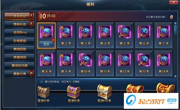功能分类:每日签到、在线奖励、离线经验、资源找回、激活码兑换签到奖励