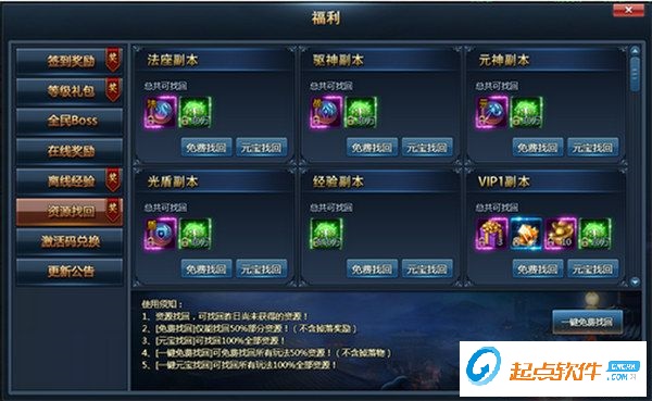 1、前一天没时间做副本、任务,参加不了活动没关系,资源找回系统可以帮你找回在副本中的收益。