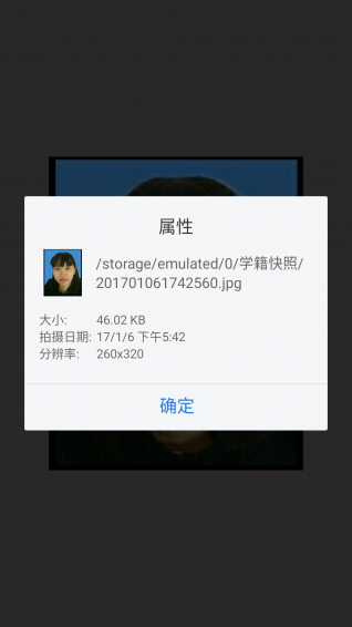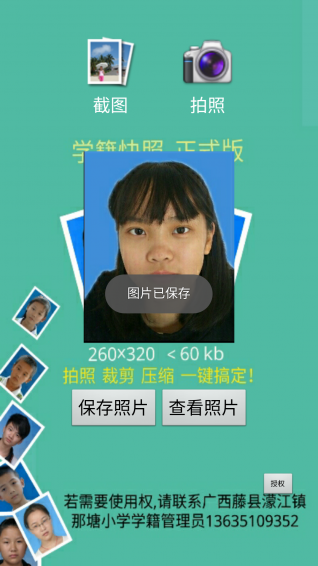学籍照快照是学籍管理员采集学生学籍照片的利器。学籍快照是利用手机拍摄学生学籍照片的手机应用,有了它学籍管理员再不用烦琐地用照相机去拍摄照片,又要一张张地用电脑剪裁照片分辨率260X320,还要一张张压缩照片大小不能大过60KB。而这些学籍快照能一键实现,拍照,剪裁,压缩手机就能轻松做到。使用说明:安装学籍快照app,打开学籍快照应用,展现在你眼前的是漂亮简洁并富有艺术性的界面。点界面中相机图片开始照相,拨动红色取景框截取头像,确定点保存照片,也可以用里面的截图按钮,截取相册或qq微信传来的照片作为头像照。点查看照片可以浏览刚才拍摄的照片情况。