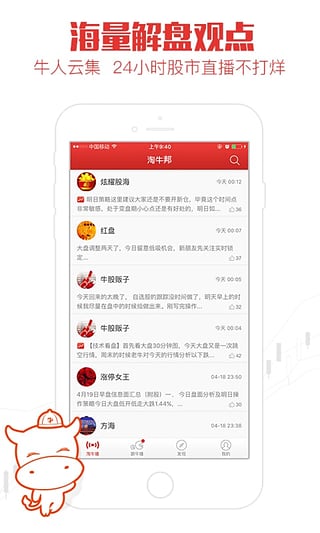 淘牛邦:数百位牛人、名家在线亲自教你投资技巧,炒股操作技巧,新股民0基础学习,想成为股票操作高手,手机在手,足不出户,全天24小时不间断在线实盘教学。