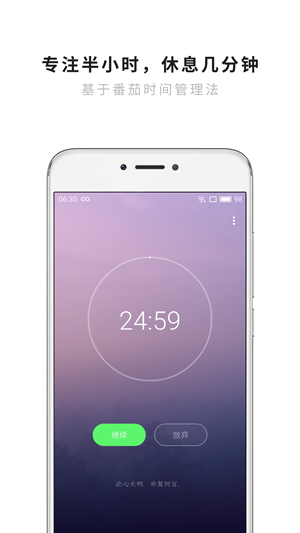 - 基于番茄工作法,每次专注 25 分钟,间隔休息 5 分钟