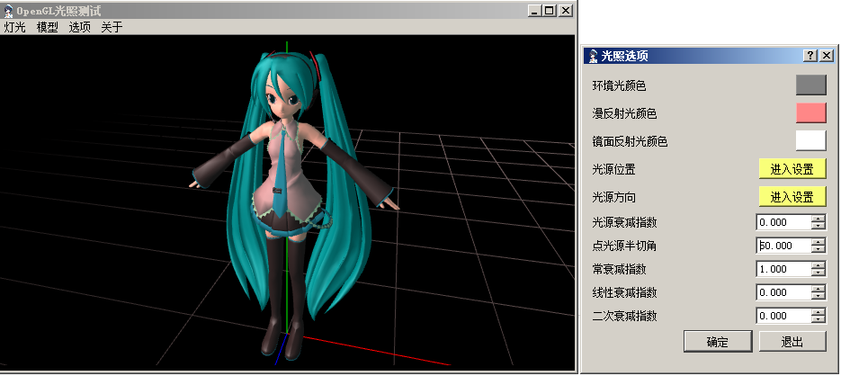 4.光照和材质设置:OpenGL光有自发光(Emitted Light)、环境光(Ambient Light)、漫反射光(Diffuse Light)和高光(Specular Light)。材质是用光反射率来表示。场景(Scene)中物体最终反映到人眼的颜色是光的红绿蓝分量与材质红绿蓝分量的反射率相乘后形成的颜色。