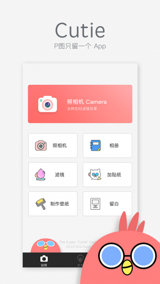 Cutie相机是一款功能非常强大的P图软件。想让你的照片p得更好看,像专业摄影师拍出来的一样吗?Cutieapp上有多种滤镜,海量贴纸、素材,让你的照片更生动、更有趣!【软件特点】