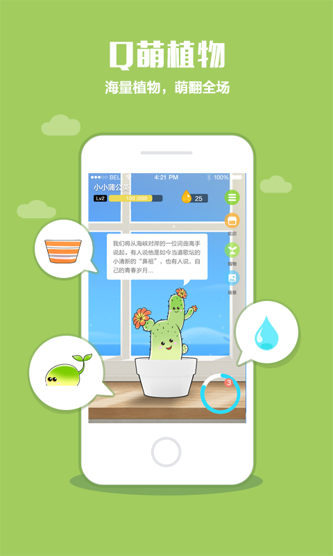 口袋植物是一款集植物养成与交友聊天于一体的养成社交类应用。种植Q萌可爱的植物,浇水、互动、玩游戏,见证植物从幼苗到成熟的全过程,享受种植的乐趣。每一个成长阶段,青翠欲滴的植物会呈现不同的动漫形象,或调皮的吐吐舌头,或眨巴眨巴眼睛,或摇摇花枝咧嘴大笑,渴的时候就露出伤心的表情等你来喂水,让人怜爱不已。萌萌的植物心有灵犀,可以连接植物圈的帅哥美女,遇见新朋友,搭讪萌妹子,还有机会扫描出隐藏宝箱,获得神秘奖品哦!
