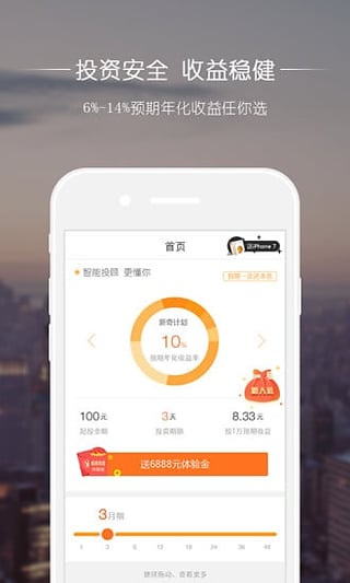 1、新奇计划——注册之日起15天内享有一次投资机会,100元起投,15天预期年化收益高达15%!2、奇猜计划——在预期年化收益8%的基础上,竞猜赢得最高至18%的预期年化收益。