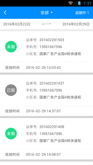 【查询快件】 实时掌握您投递的快件动态,不放过一丝一毫; 重发提取码功能助您派件无虑无忧;