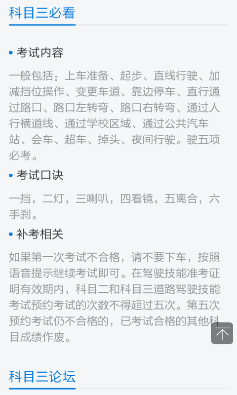 科目三考试技巧 v2.0 安卓版 科目三考试技巧是一款便捷的掌上驾考学习类应用。该应用集科目一和科目三的考试习题为一体,更有科目二和科目三的学车技巧,为驾考考生提供更好的备考资源。