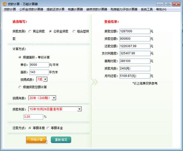可帮助用户计算在购买二手房申请商业贷款时,选择等额本金和等额本息等不同的还款方式后,各自需要偿还的月供、利息总额和还款总额。