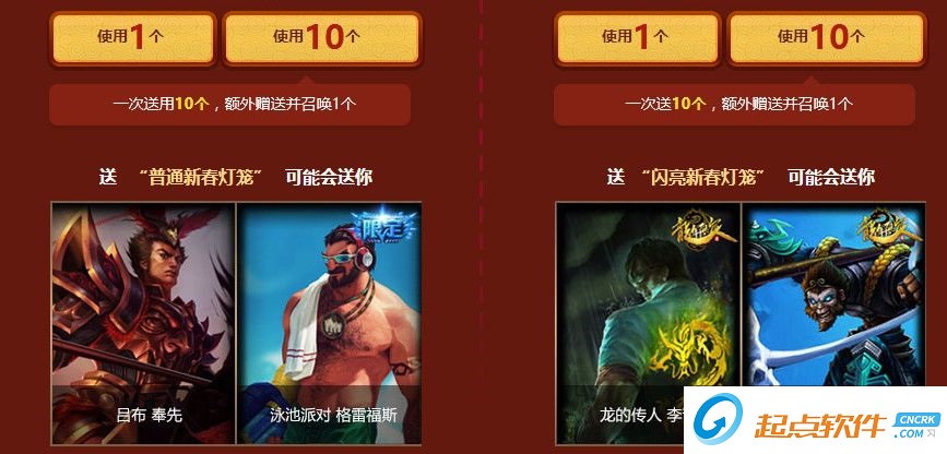 本次活动提供”送10个”功能,每次使用”送10个”功能会额外获赠并送1个对应级别的新春灯笼。