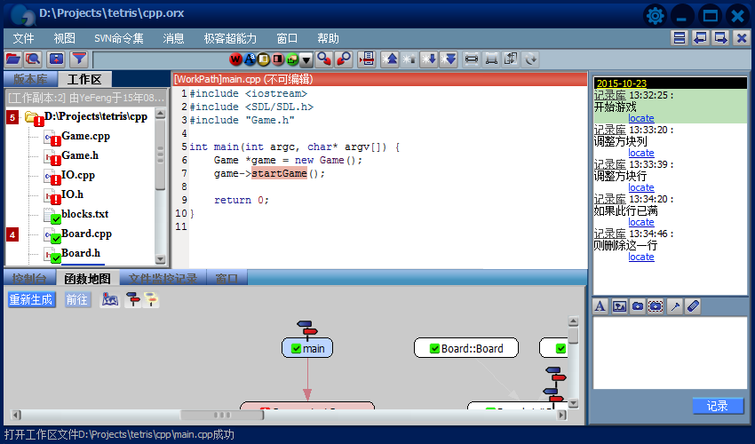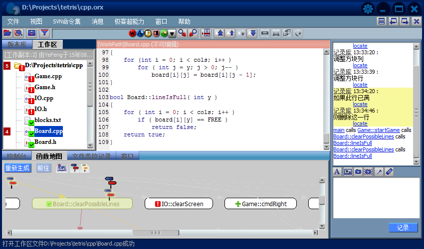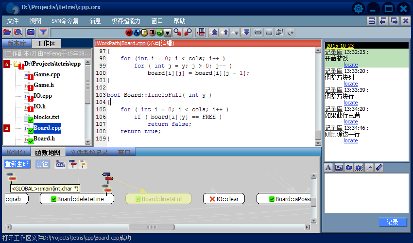 4.消息更丰富的表现形式带来了更强大的功能,除了充当阅读源代码时的注释,还能在版本库导航栏中指示某个版本,某处代码的修改;在函数地图中建立消息路标,指出其它代码与它的调用关系。