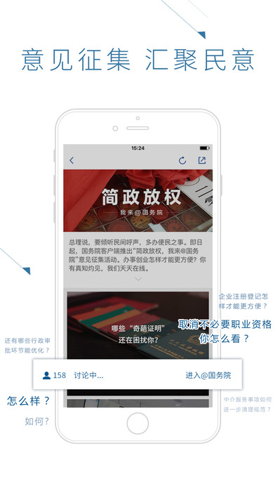 国务院客户端现开通要闻、总理、政策、部门、地方、服务、督查等栏目,第一时间权威发布国务院重大决策部署和重要政策文件、国务院领导同志重要会议、考察、出访活动等政务信息,同时面向社会提供与政府业务相关的服务,建设基于新媒体的政府与公众互动交流新渠道。【更新日志】