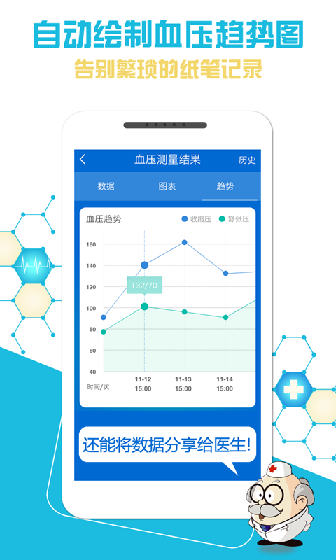 『历史数据』自动记录血压绘制血压数据趋势图,帮您统计分析,免去繁琐的纸笔记录;