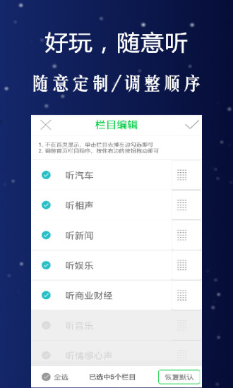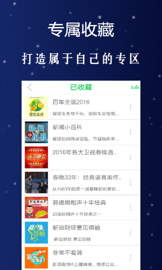 5.专属于你的电台:基于所在的地理位置主动为你进行电台推荐,首先推荐本地和同省电台,让你极快享听;“已收藏”节目极快播放让你声随意动;随意添加收藏周边、网络电台,让你听的更多。