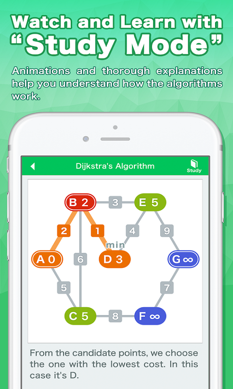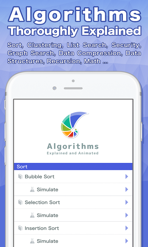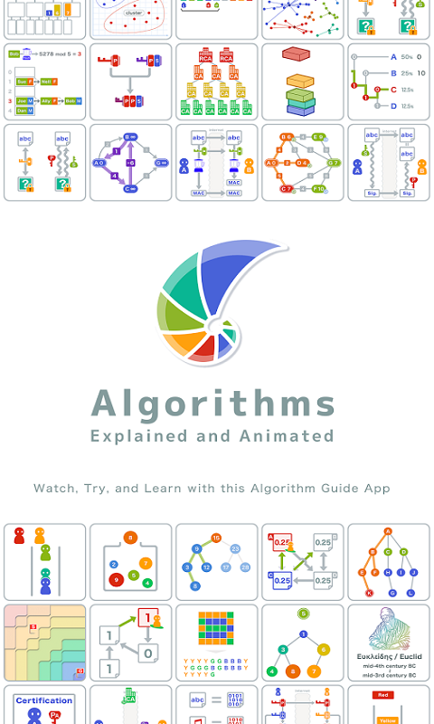 享受观看,尝试以及学习教程来使用算法。在这个应用里大量的算法都经过精心设计的动画来详细的解释。通过模拟模式来进一步的理解算法。同时还有很多关于加密和安全的算法。来吧,我们现在就起程前往一个充满了算法的世界!