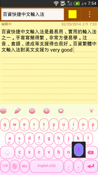 1.支援10万组繁体中文词汇,6万Prediction词组及最新流行用语;2.支援注音模糊输入,让使用者只需输入第一个注音、Tune或部份就可以选择候选词汇;