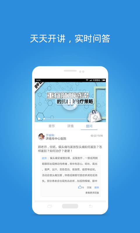 1、通过直播与全国权威专家在线沟通,如同面对面交流,快速提升医术。2、随时随地看专家讲课视频,碎片化时间内边学习边提问,稍后就有同仁帮您解答。