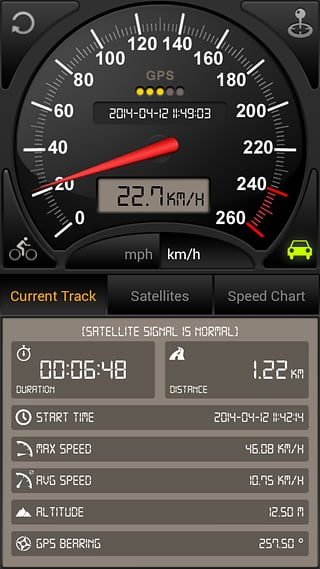 GPS仪表盘 可以追踪速度、距离、时间、位置等,并可得到启动时间、耗费时间、距离、平均速度、最大速度和高度等信息。