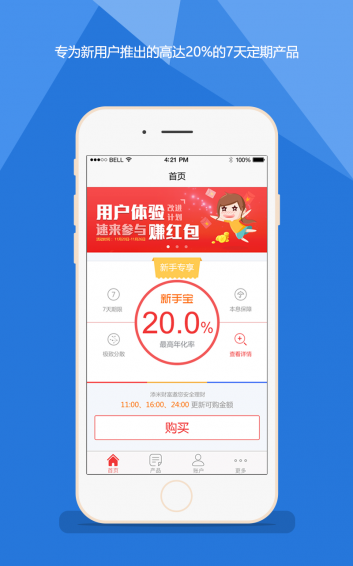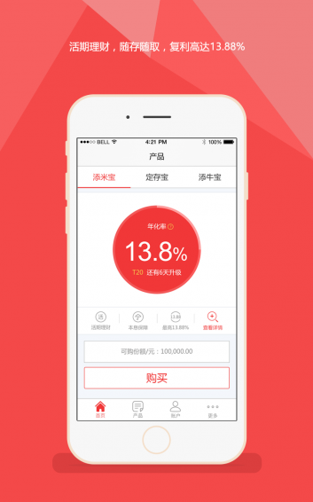 1、新手宝:专为新用户推出的高达20%的7天定期产品2、添米宝:活期理财,收益随日递增,复利最高可达13.88%。4倍余额宝收益,随存随取,每日计息,自动复投,理财轻松不操心
