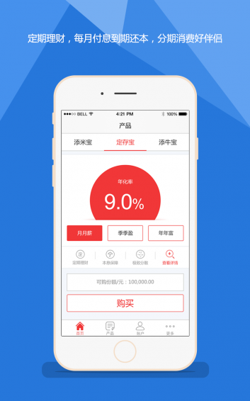3、定存宝:1月、3月、12月定期产品,年化收益率分别为9%,10%,12%,每月付息到期还本,分期消费好伴侣
