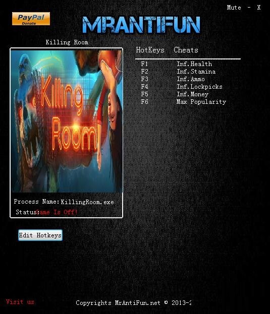 杀戮房间六项修改器 v1.8.1 MrAntiFun版 杀戮房间修改器是一款专为《杀戮房间》游戏玩家所提供的游戏修改工具。该工具不仅小巧绿色,还可免费提供六项强大的游戏修改功能,有需要的玩家自行下载。
