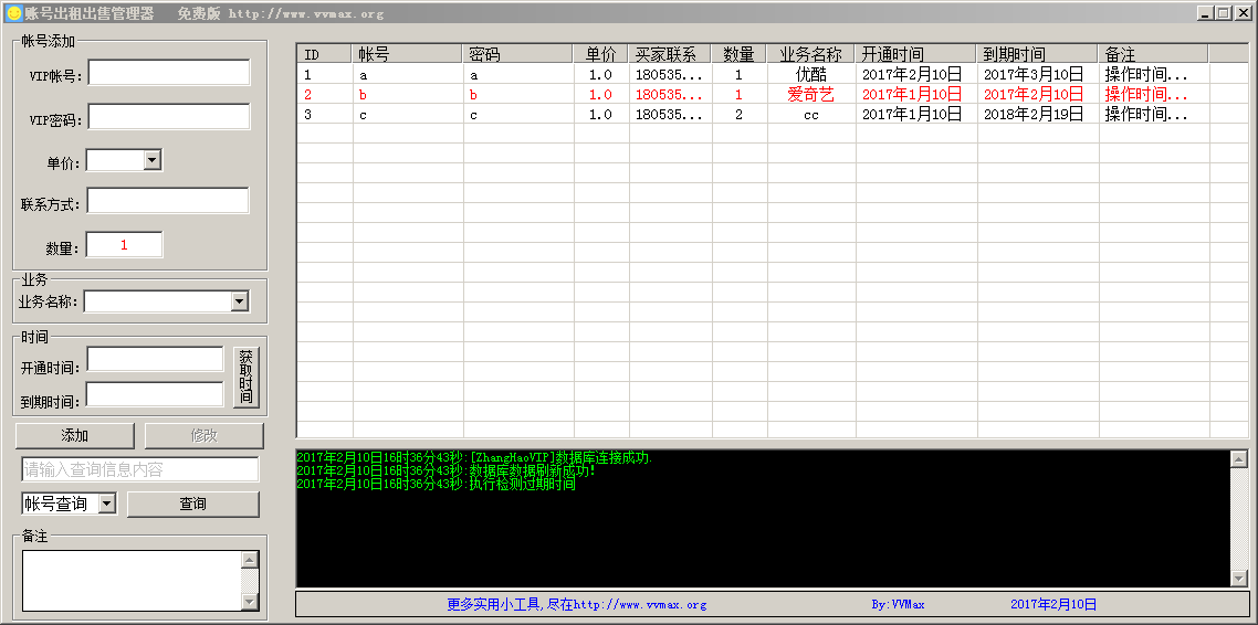账号出租出售管理器是一款小巧便捷的账号出租或出售管理软件。它的操作非常简单方便,用户只需要添加账号写好到期时间,到期当日账号就会被自动标红,超级简单。