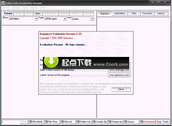 FolderInfo V2.25 英文绿色特别版 FolderInfo是一个可以帮你分析你的硬盘机状况,并且可以帮你清除一些 temporary临时且无用的档案和数据夹,也可以打印出你硬盘档案的树状结构表并可储存成 text, html or xml的档案格式来供你方便的阅读,他也会将你硬盘中每一数据夹所占用的容量一一显示出来,让你更加了解你的硬盘目前的使用情形。安装到原文件安装目录下,覆盖目标文件即可。