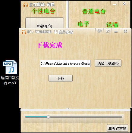 打开软件,可以点击左侧的“拒绝死宅”,“路上听的好”,“给你好心情”,“温暖纯音乐”,也可以点击右侧的普通电台选项、年龄电台选项有喜欢的曲目可以点击“我要这首歌”后点击下载,将会将歌曲下载到指定路径