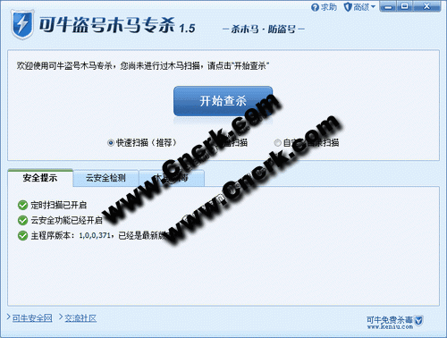 可牛盗号木马专杀工具 V1.5 简体中文绿色免费版 《可牛盗号木马专杀》是专为网游防盗号量身打造,完全免费的木马专杀软件;基于100%的可牛云查杀技术,5分钟内快速识别最新盗号木马;二次检测只需数秒;体积轻巧,不需要进行安装,更无安装重启的担忧,下载仅需3-5秒;100%兼容所有杀毒软件,适合用户快速下载使用,无论您是在网吧,家中,公司都能够轻轻松松获得超一流的盗号木马防护功能!