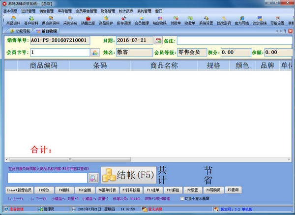 1、支持POS销售。可以根据需要选配打印机、读卡器、会员卡、条码枪、钱箱、顾客显示屏及小票打印机;可以根据自已喜好设计各种有特性的打印格式。销售时可以适时掌握每一个商品的当前库存数,销售成本、销售毛利;2、支持会员管理。可设置会员级别,不同级别可以适用不同的价格与折扣.可以自动计算会员的累计消费、累计积分、兑现积分及剩余积分情况。过生日的会员可自动提醒;