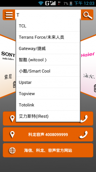 2、电器品牌售后服务电话快捷搜索、一键拨打;