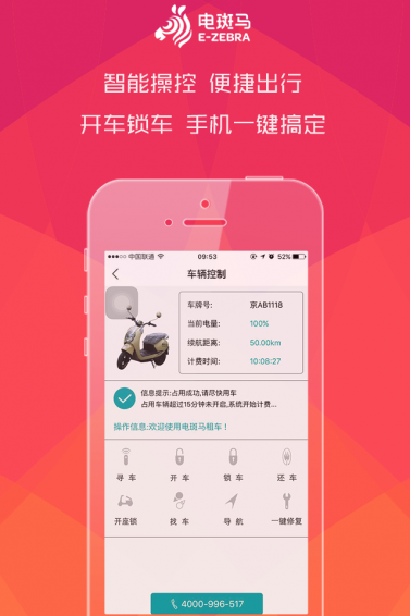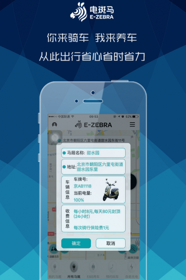 【品质出行舒适驾乘】雅迪高端智能电动车现已成为电斑马的第一副身体。意大利经典与现代设计的完美融合,品质非凡的细节原创,高端摩托车的制造标准,符合人体工程学的坐姿设计,强大逆天的防盗体系,持久力超强的电力系统,带给你安心舒适的出行体验。【自在出行省时省力】电斑马手机APP提供人、机、车三位一体的服务。注册充值并实名认证成功后,即可在附近的“马厩”实现取/约/还车、寻车、充电、导航、车辆管理、维护保养等多项服务。