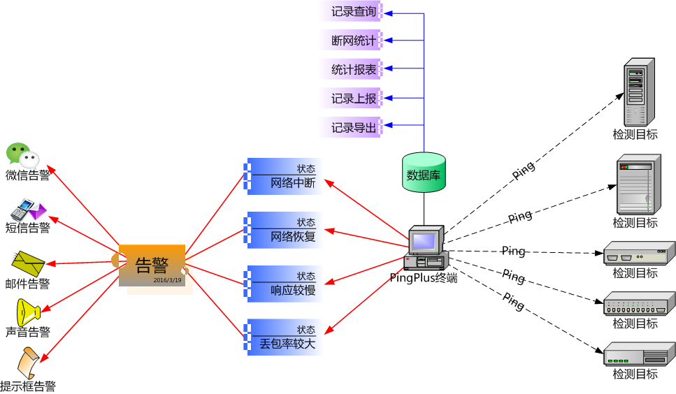 "超级Ping"支持声音、提示框、短信、邮件等多种告警方式,当检测到网络异常时实时发出告警。