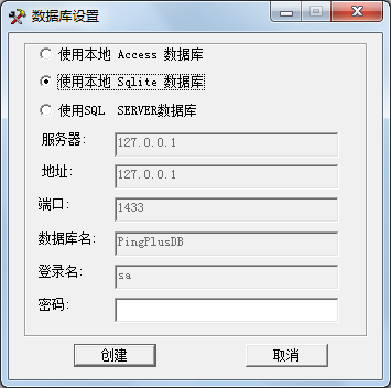 可以选择使用Access、Sqlite或者SQL Server数据库,如果使用SQL Server,则需要填写SQL Server的服务器名,地址,采用的端口,数据库名,登录名及密码,点创建,将会在指定的SQL Server服务器上创建保存记录的数据库。如果选择Access或者Sqlite,则会使用系统自带的本地小型数据库。