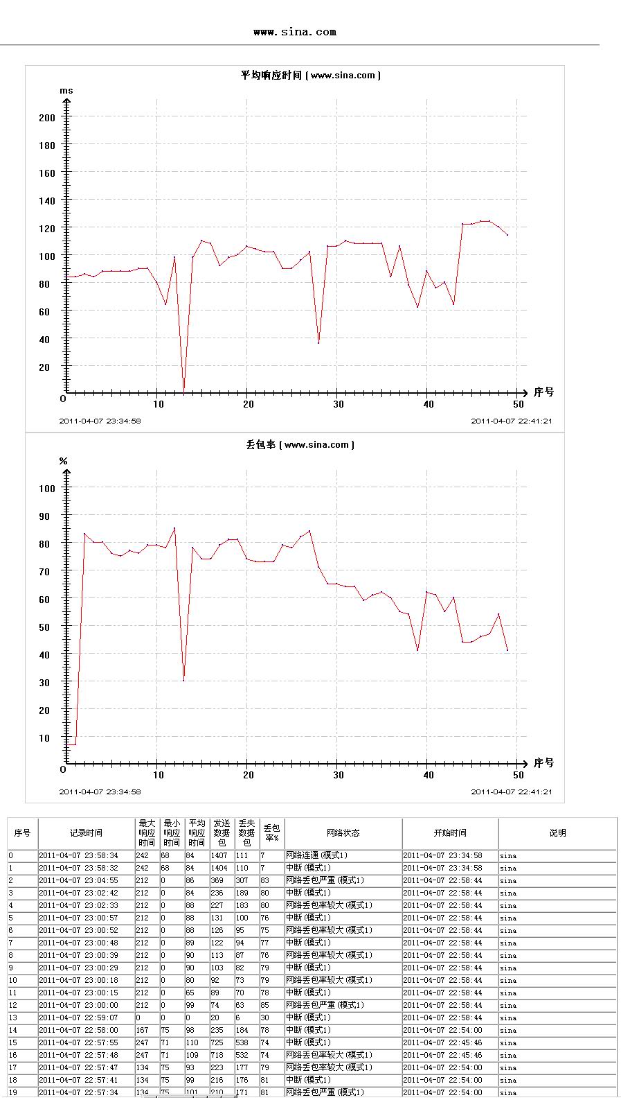 以图表的方式显示出平均响应时间、丢包率的曲线图。图表上的原点“O”位置,表示的是离现在最近的时间,随着X轴越远,表示时间越早。 X轴的刻度数与详细记录数据的序号(记录时间)相对应。