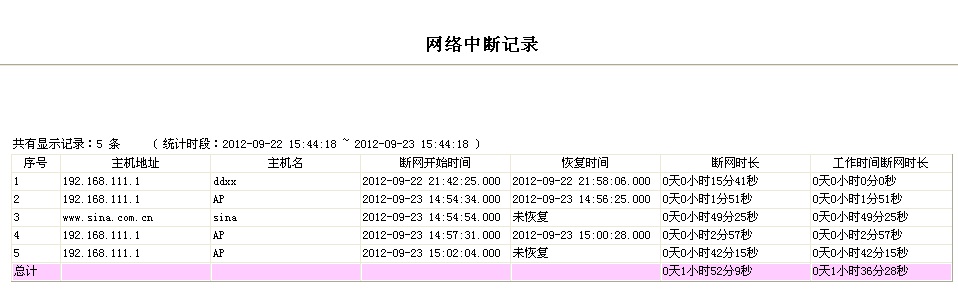 统计出指定时间段内某地址(或所有IP地址)的断网次数、断网时长及网络恢复情况等数据。