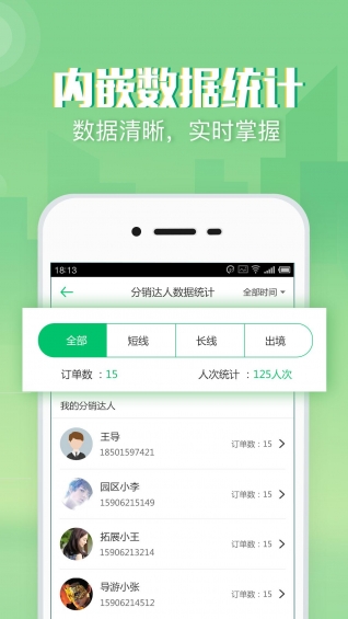 分销商用户可以通过应用进行旅游产品查找、分享、下单;消息通知;订单处理;一键分享店铺;客户管理等操作。供应商用户可以通过应用进行店铺内产品预览及分享,订单消息实时通知,经营数据统计查看等操作。