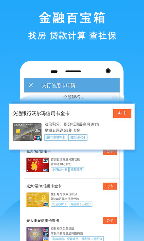 公积金贷款:一键申请,审核简单,飞速放款;公积金信用卡:在线办卡,成功率更高,审批速度更快,更有白金卡等多种卡种任君挑选。