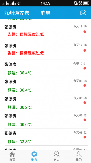 九州通养老App是由感讯科技有限公司悉心打造的互联网智能化养老服务平台,血压计、额温计等医疗级的智能硬件测量数据随时查看,使用专业的一键呼救和定位功能的可穿戴手表,可以时刻关注老人动态,App可以直接为老人订餐、预约按摩等相关医疗服务,还可直接预上门服务,为老人提供健康保障。【软件特色】
