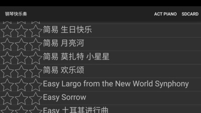 《钢琴快乐奏》配有十余个简单的钢琴小品(祝你生日快乐,所有漂亮的小马儿,新世界交响曲,致爱丽丝等)。他们可做为你刚学的钢琴课。由于《钢琴快乐奏》可以从SD卡中加载MIDI(*.mid文件),你可以练习任何你喜欢的歌。
