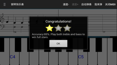 《钢琴快乐奏》在自由弹奏模式中,视图显示按下钢琴键对应的音符玩。启动《钢琴快乐奏》,触摸键盘,你就会知道其中的差别。在你学习弹奏钢琴曲时,五线谱视图对于弹钢琴的功能更为强大。