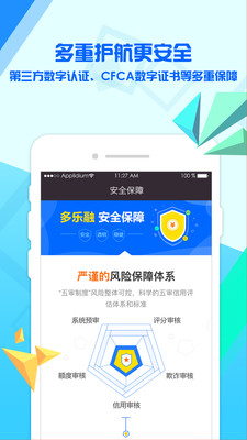 多乐融平台是恒昌旗下专注于移动端的网络借贷信息中介平台,依托恒昌多年风控信用管理经验和严谨的风险保障体系,确保每一笔借款标的的真实与安全。与此同时,平台还积极推进业务资金存管工作,以维护每笔交易的真实、安全和透明。