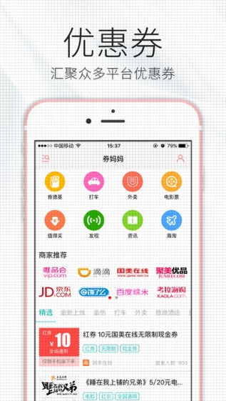 券妈妈每日发放近8万张优惠券,滴滴打车、饿了么、肯德基、百度糯米、美团外卖、京东、唯品会、1号店、携程、6PM等知名商户免费优惠券天天领到手软。