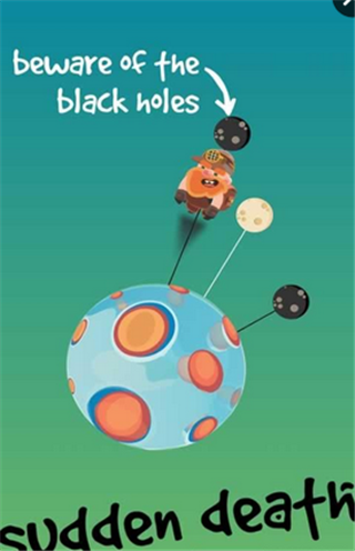 游戏中你要控制一个小小弹跳矿工,在不同的星球表面收集白色的卫星,同时还要躲开黑洞。看似简单,但是突然改变旋转方向的星球有时候会让你措手不及。游戏的操作比较简单,点击屏幕可控制角色跳跃,如果长按屏幕则会在空中悬浮。