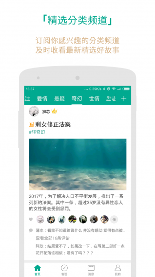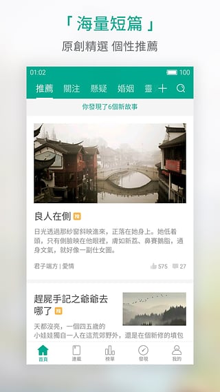 【个性化阅读】爱情悬疑婚姻灵异古风世情传奇等分类频道,“深夜奇谭”“爱物语”“轻奇幻”等个性标签——看你喜欢的故事。