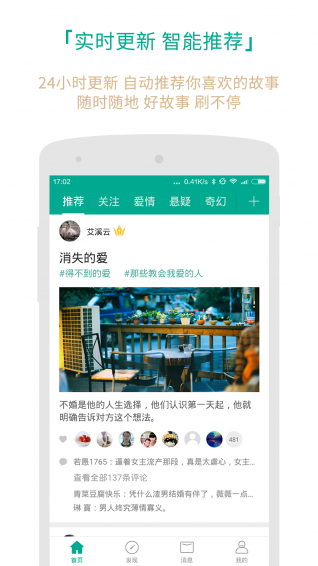 智能推荐引擎,自动识别你的兴趣,24小时滚动更新好故事;